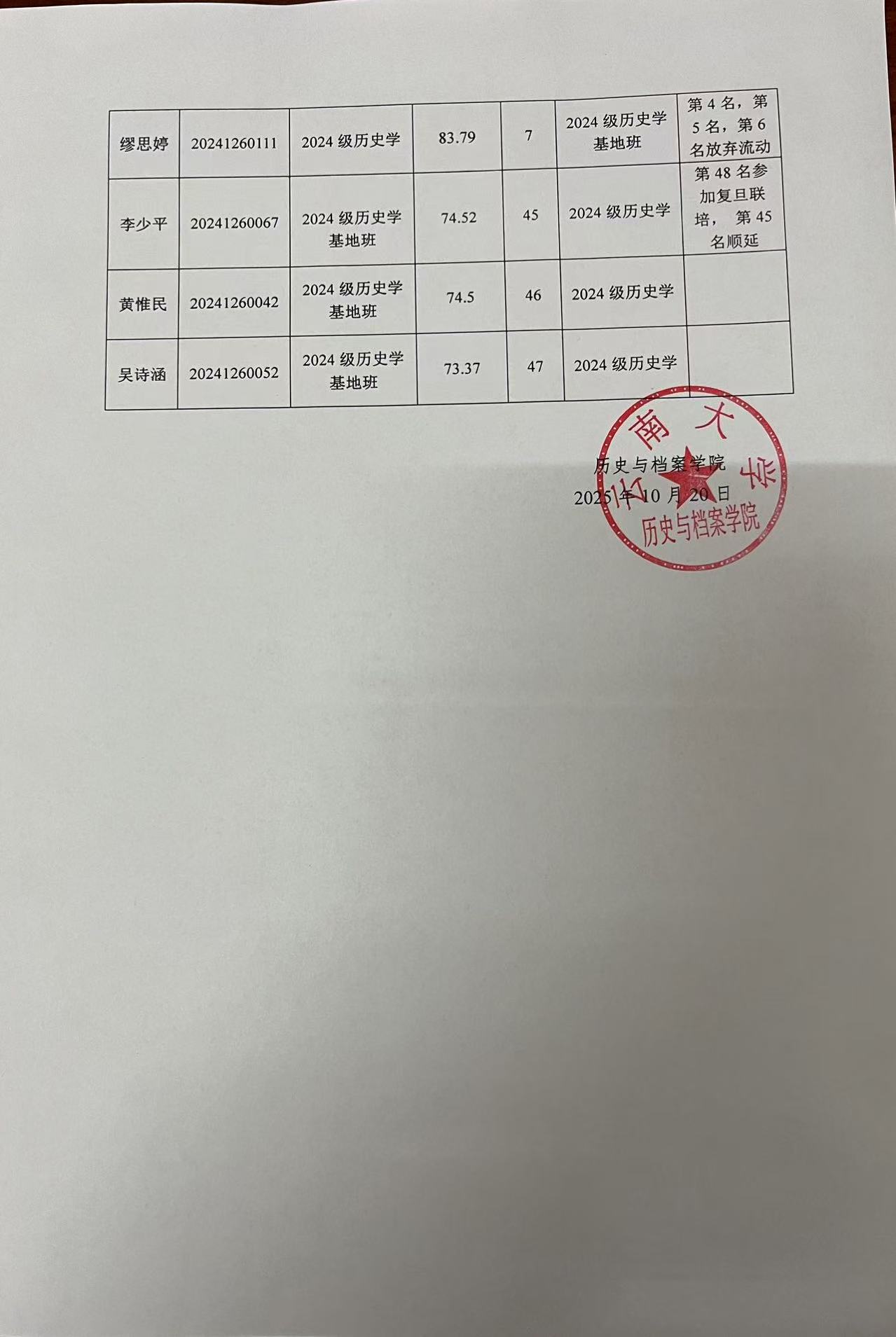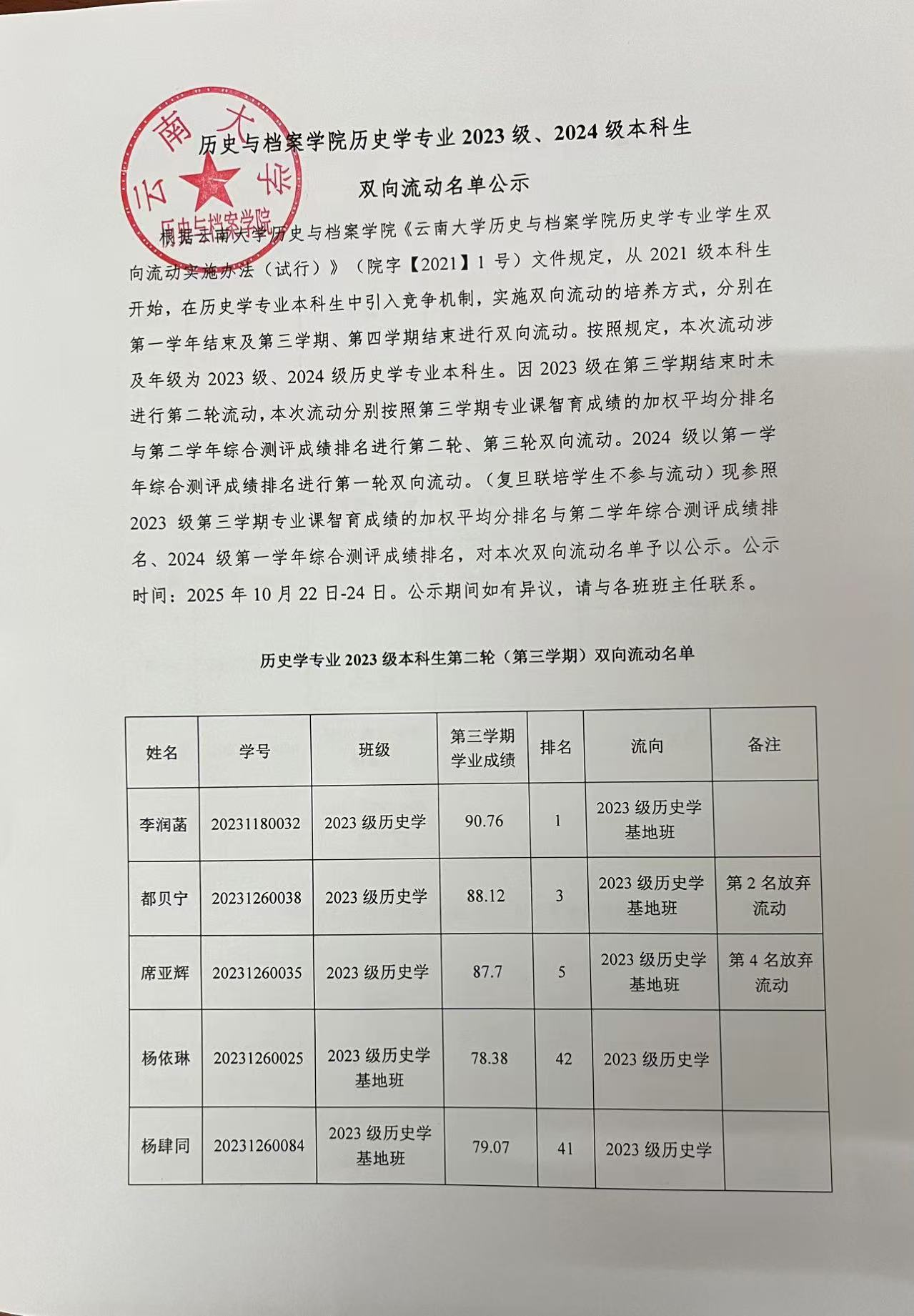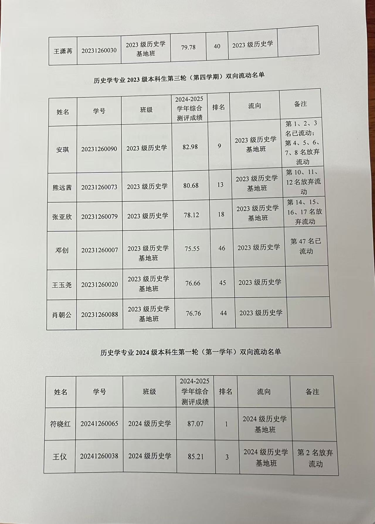 历史与档案学院历史学专业 2023 级、2024 级本科生双向流动名单公示