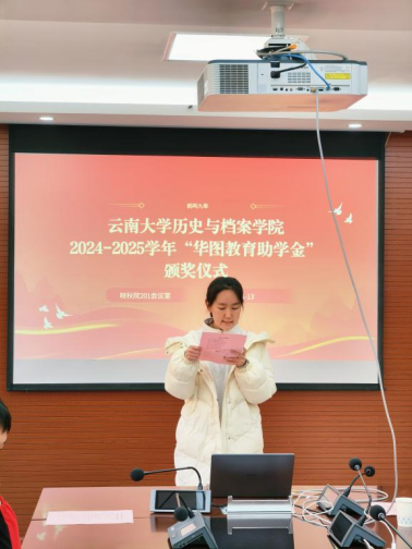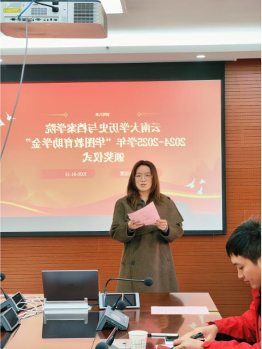 随后,学院团委书记杨阳宣读了《历史与档案学院“华图教育助学金”项目管理办法》并宣布第三届“华图助学金”受助学生名单。获得本次助学金的有2023级档案学专业的林淑银、汤绍佳、冉燕鸟、刘晶,2023级信息资源管理专业的徐嘉利,2023级历史学专业的孔姝茗、都贝宁、吴欣珏,2023级历史学(国家历史学基地班)的赵乙溯、乔依。