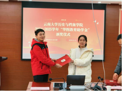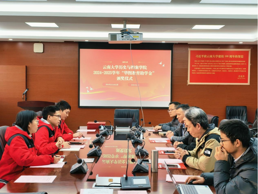 2026年1月13日上午,云南大学历史与档案学院第三届“华图助学金”颁奖仪式在东陆校区映秋院201会议室召开。华图教育云南学工部李娟部长,华图教育昆明分校赵应江经理,华图教育云南高校渠道部孔德任经理;云南大学教育基金会姬乃建副秘书长,云南大学历史与档案学院党委书记赵小平,党委副书记范俊,副院长周铭、黄体杨,团委书记杨阳,第三届“华图助学金”10位受助同学参加了此次活动。会议由范俊副书记主持。
