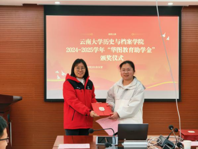 华图教育云南学工部李娟部长,华图教育云南高校渠道部孔德任经理,华图教育昆明分校赵应江经理;云南大学教育基金会姬乃建副秘书长,云南大学历史与档案学院党政领导共同为受助学生颁发荣誉证书。